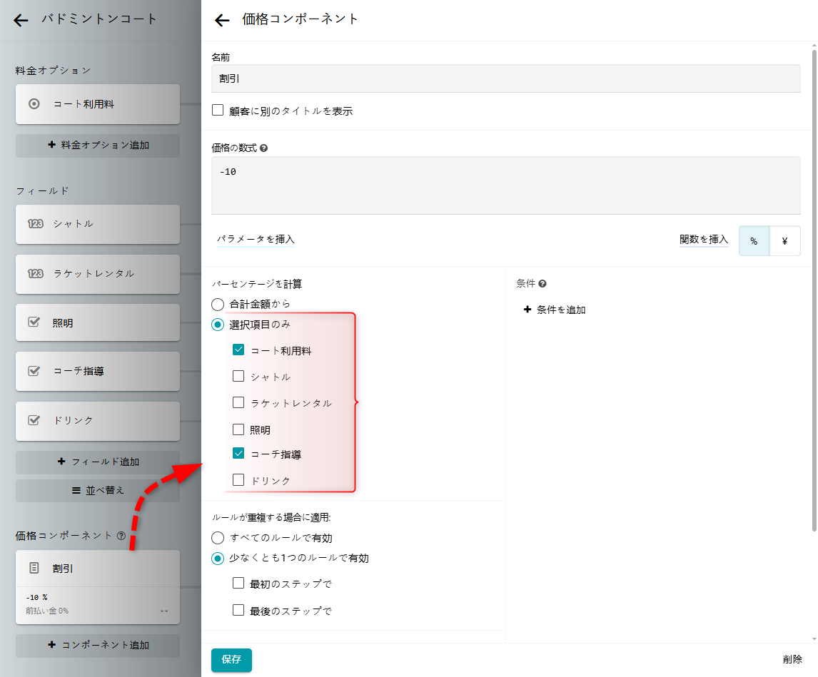 というオプションを選択します。 その後、割引計算に含める料金オプションやフィールドを指定できます。