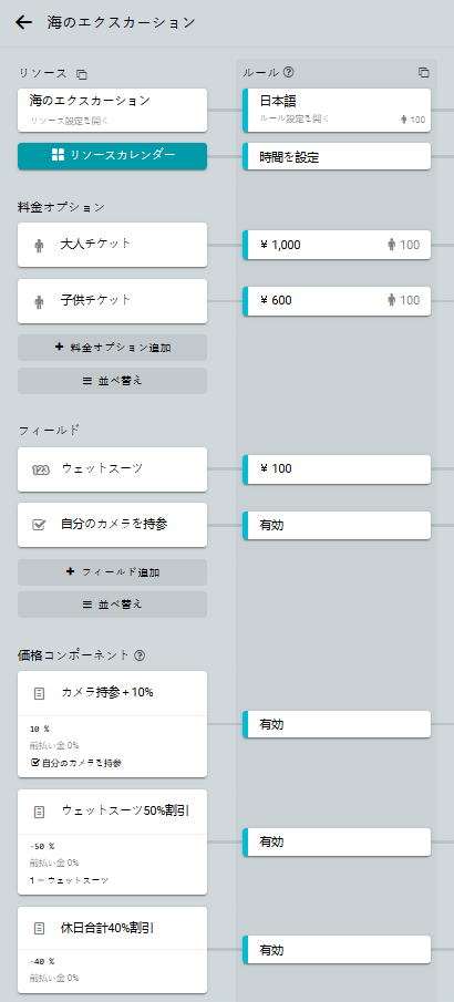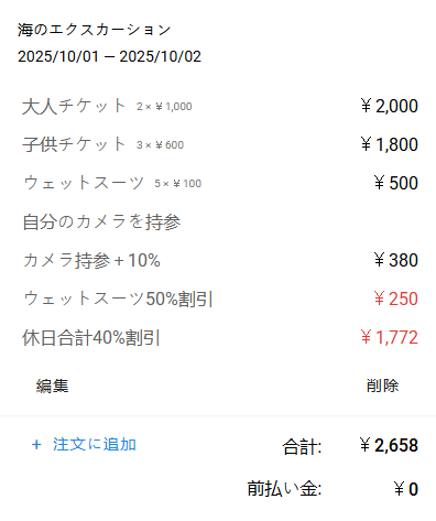 この価格コンポーネントでは、料金オプションのみが計算に含まれます。 つまり、ウェットスーツの金額は追加料金の計算には含まれません。