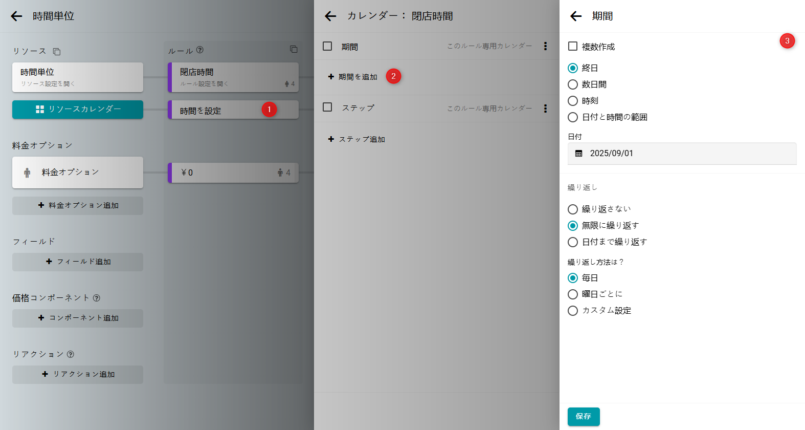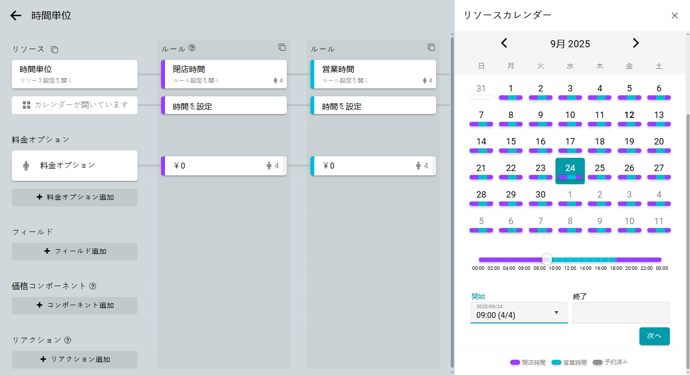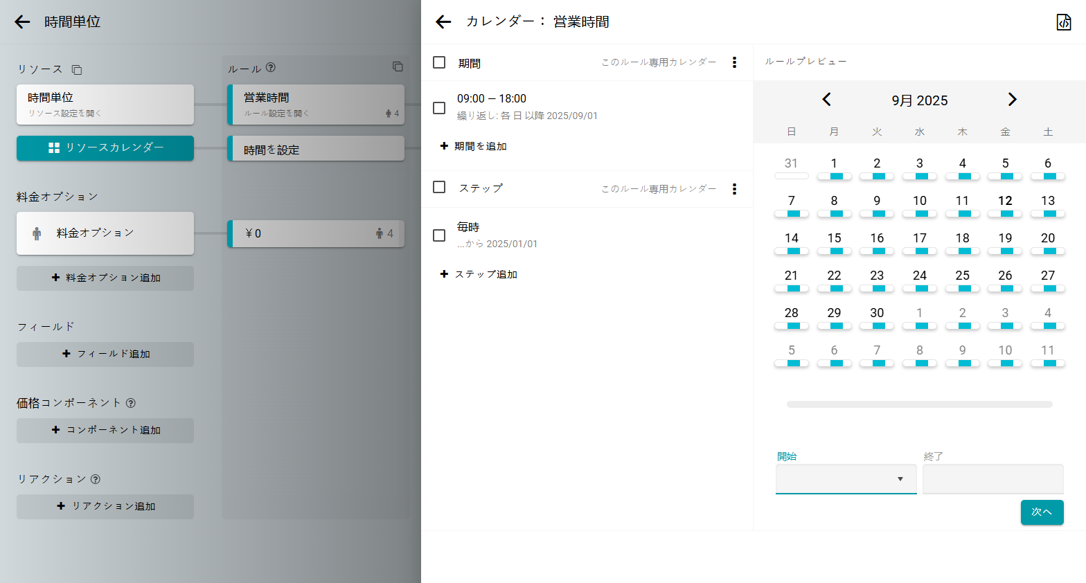 時間単位レンタル用のルールを作成します。 例えば、営業時間が毎日09.00から18.00までの場合です。