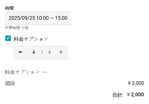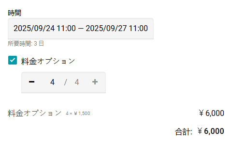 設定を確認してみましょう。 3日間、4シェアを予約します。 計算式は:500 * 3 * 4 = 6,000円 となります。