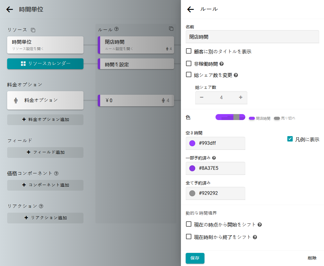 営業時間のルールでは、料金オプションを0に設定します。 時間単位レンタルの価格は次のステップで設定します。