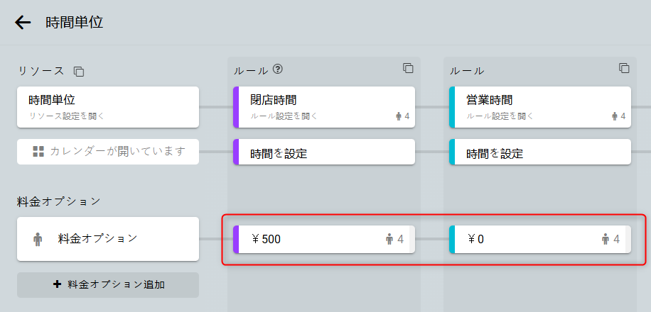 閉店時間のルールで日単位の価格を設定します。 例:1区間あたり500円。 この場合、区間は夜間です。