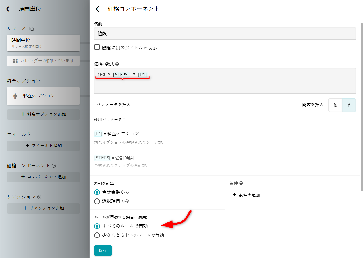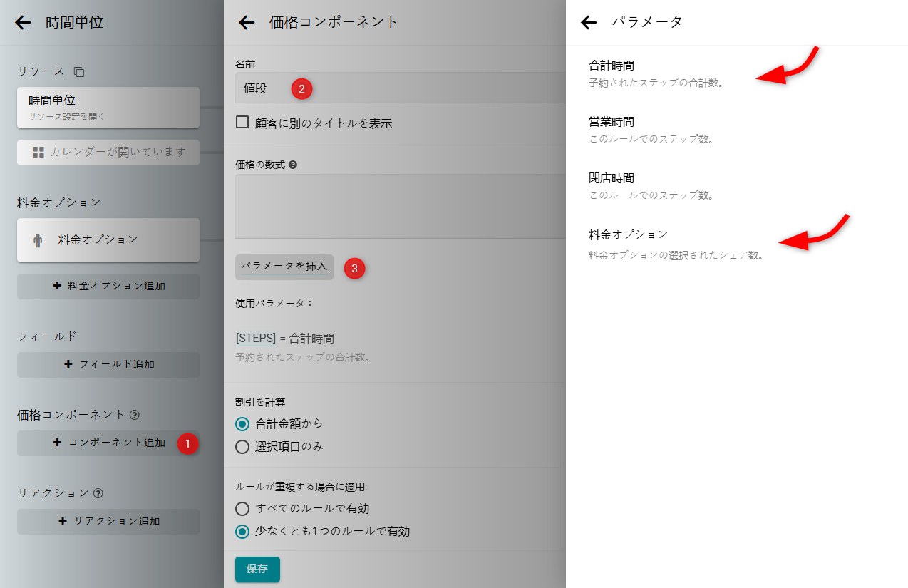 コンポーネント名を入力します。 パラメータを挿入ボタンをクリックします。 時間単位の合計期間[STEPS]と料金オプションのシェア数[P1]のパラメータを挿入します。