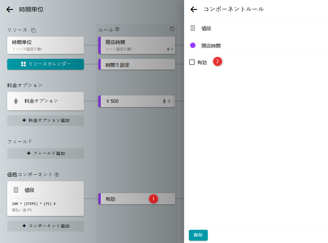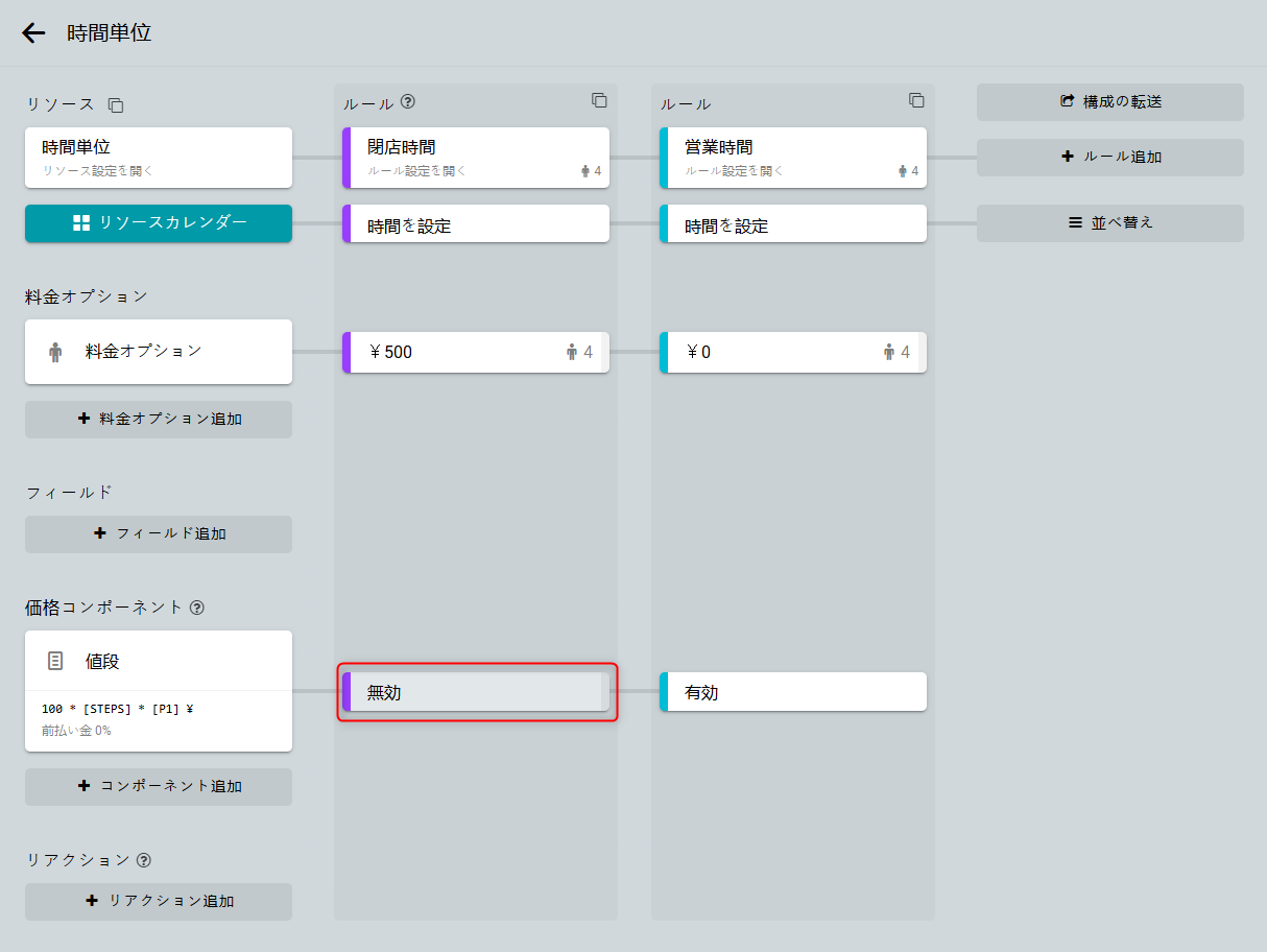閉店時間のルールでは価格コンポーネントをオフにします。 これで、営業時間中の予約のみ時間単位の料金が計算されます。 閉店時間の区間が予約された場合のみ日単位の料金が適用されます。