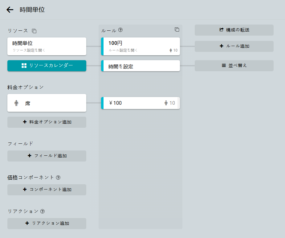 すでにルールが設定されたリソースがあるとします。 例えば、1時間あたり100円でレンタルできるアイテムがあり、利用可能な席数は10席のみです。