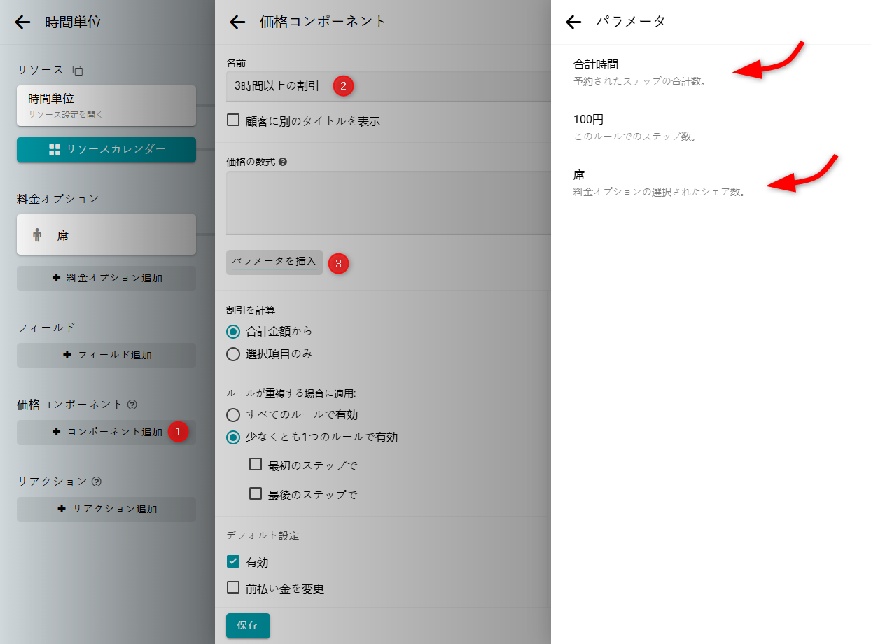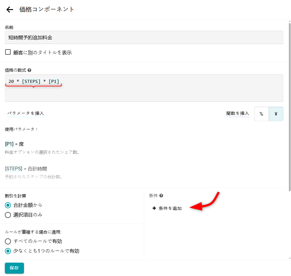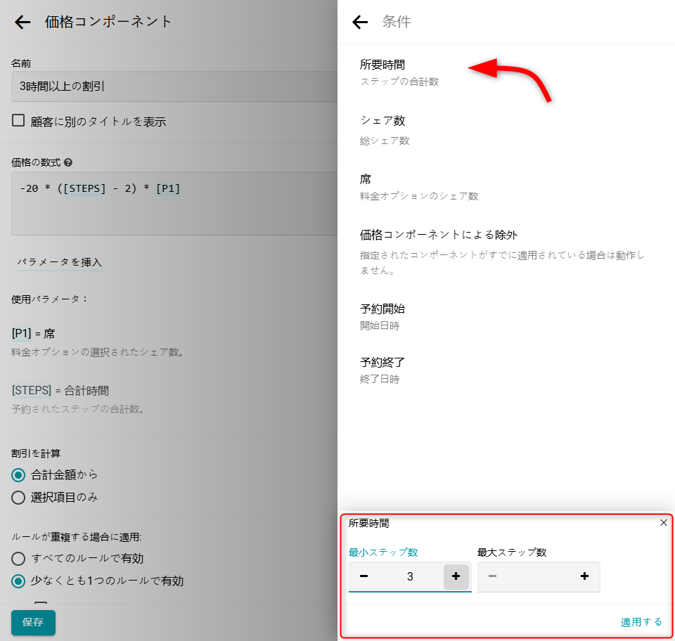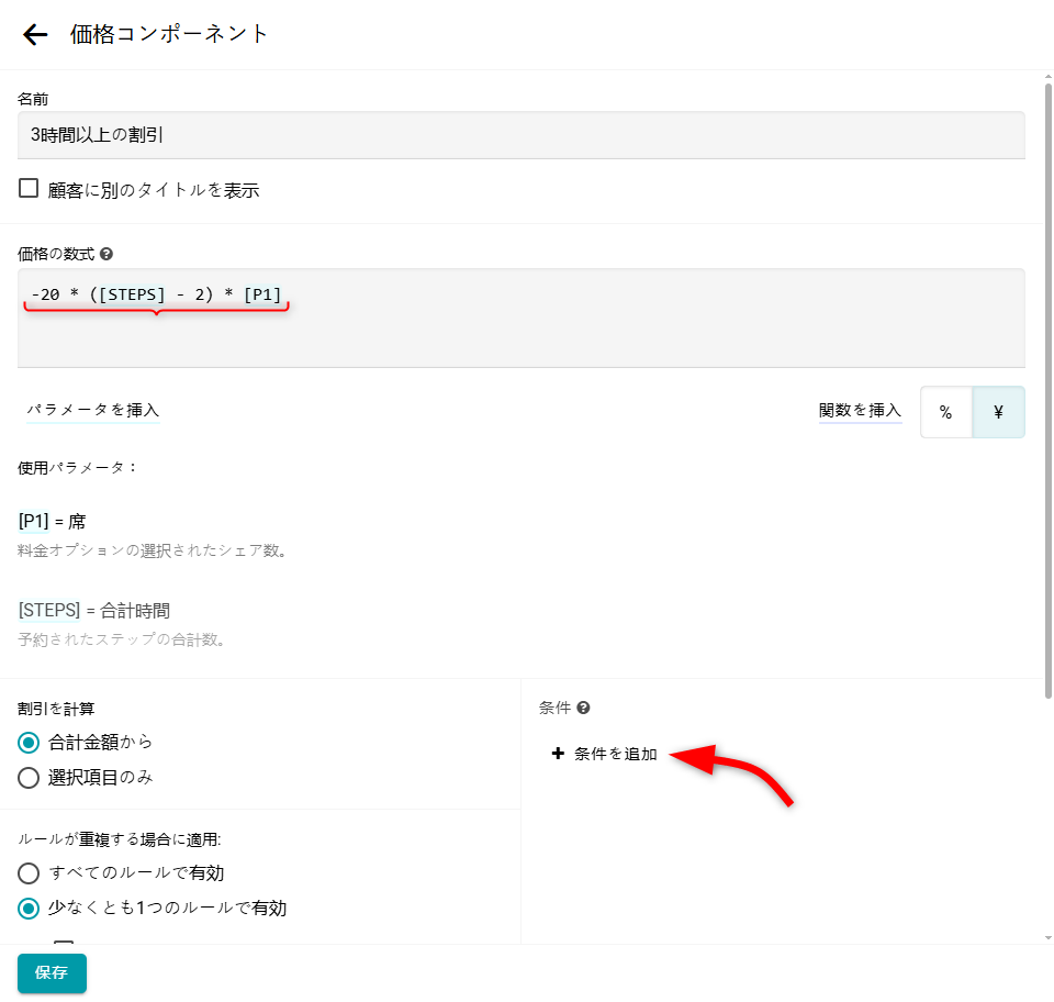 逆のアプローチも可能です。 3時間未満の予約に対して、1時間あたり20円の追加料金を加算します。 そのためには、まず1時間あたりの価格を80円に設定します。 その後、価格コンポーネントを作成します。