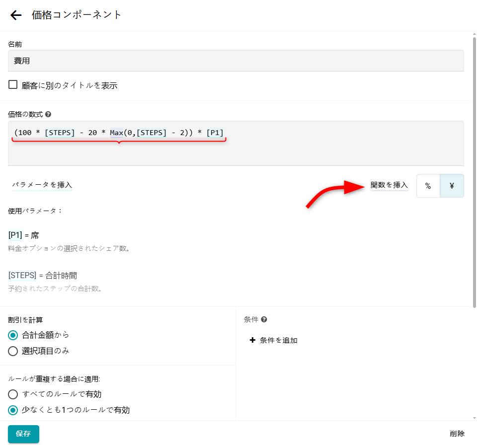 コンポーネント名を入力します。 パラメータを挿入ボタンをクリックします。 これにより、所要時間(時間数[STEPS])やシェア数(席数[P1])のパラメータを挿入できます。