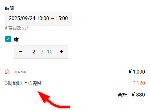 数式を入力します。 2時間を超える分の時間に対して、1時間あたり20円の割引を掛けます。 その結果に予約した席数を掛けます。