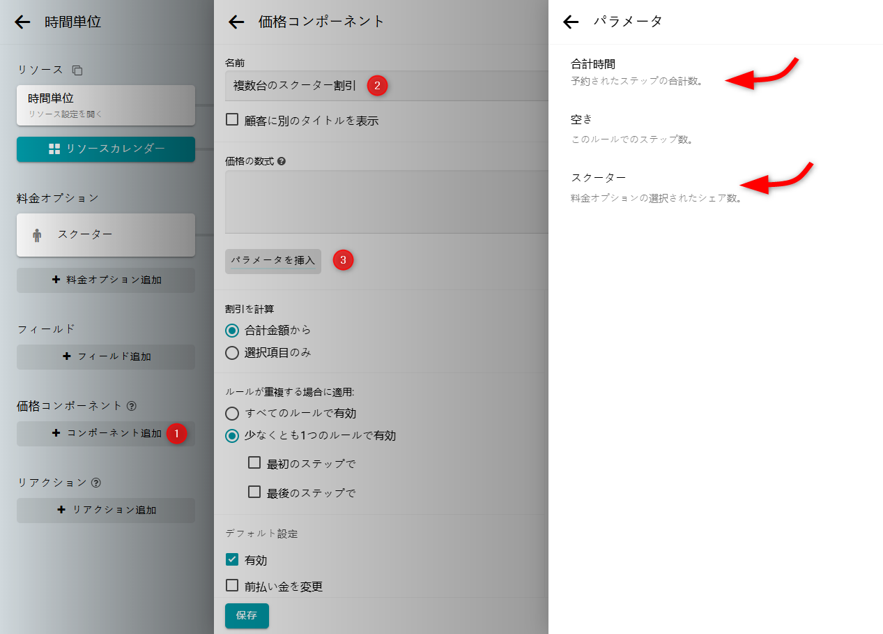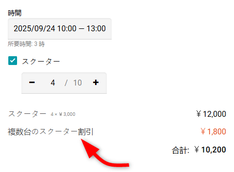 複数台のスクーターをレンタルする際に割引を提供するには、2台以上のレンタルで割引となる価格コンポーネントを作成してください。 価格コンポーネントを追加します。