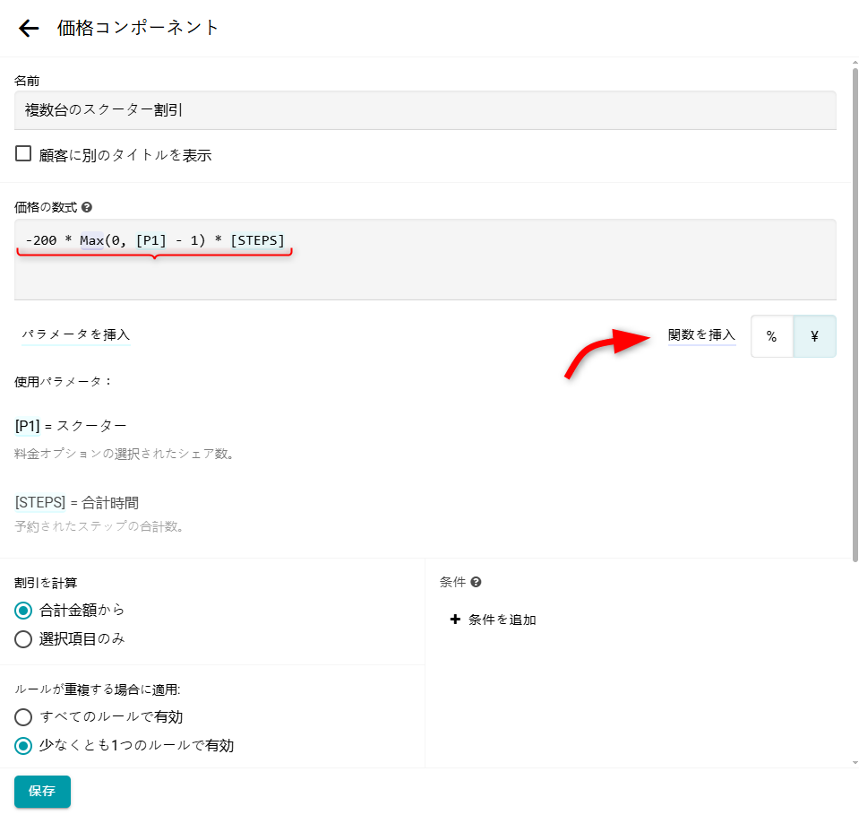 数式を入力します。 200円の割引は、2台目以降のスクーター台数分だけ掛け算されます。 その結果に、[STEPS]パラメータ(予約した時間数)を掛けます。