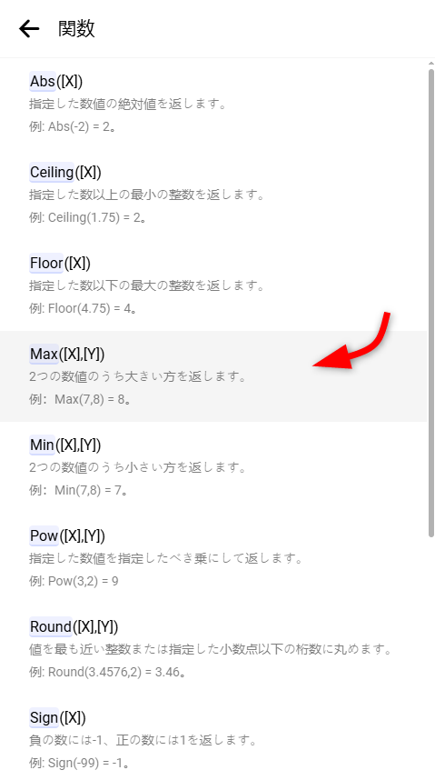 数式内ではMax関数を使用します。 この関数は、2つの数値のうち大きい方を返します。 そのため、[P]-1という式が0未満になることはありません。 関数を追加するには、関数を挿入ボタンをクリックし、リストからMaxを選択してください。