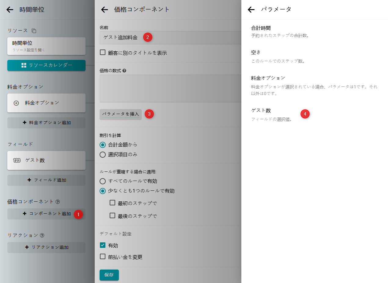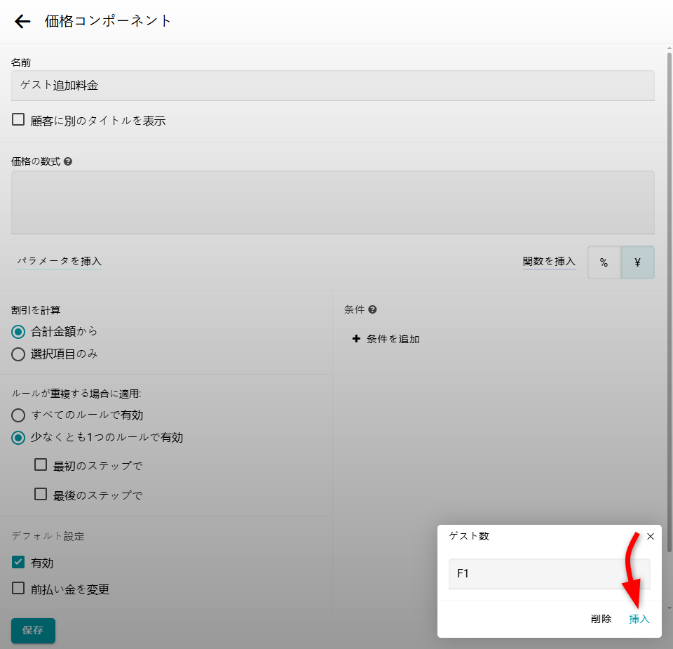 コンポーネントの名前を入力します。 数式を作成するには、「ゲスト数」フィールドのパラメータ F1 を挿入します。