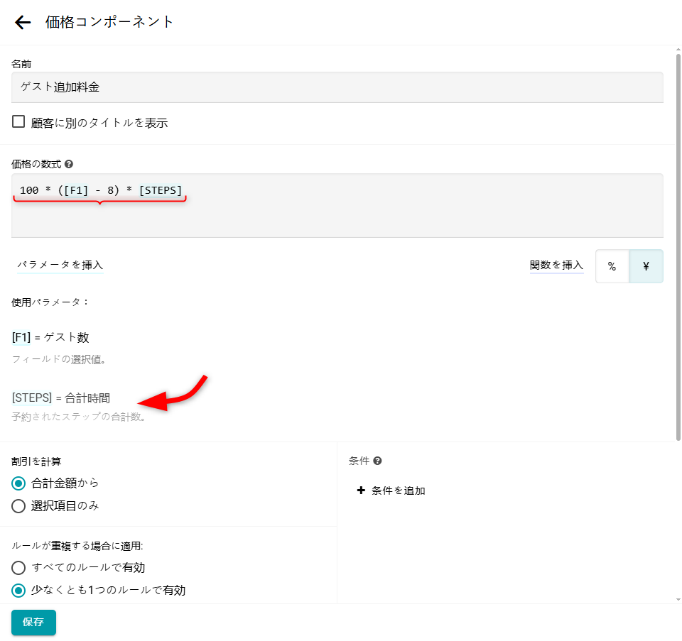 100円に、8名を超えたゲスト数を掛けます。 その結果に、予約された時間数を掛けます。 これを行うには、時間数のパラメータ STEPS を挿入します。