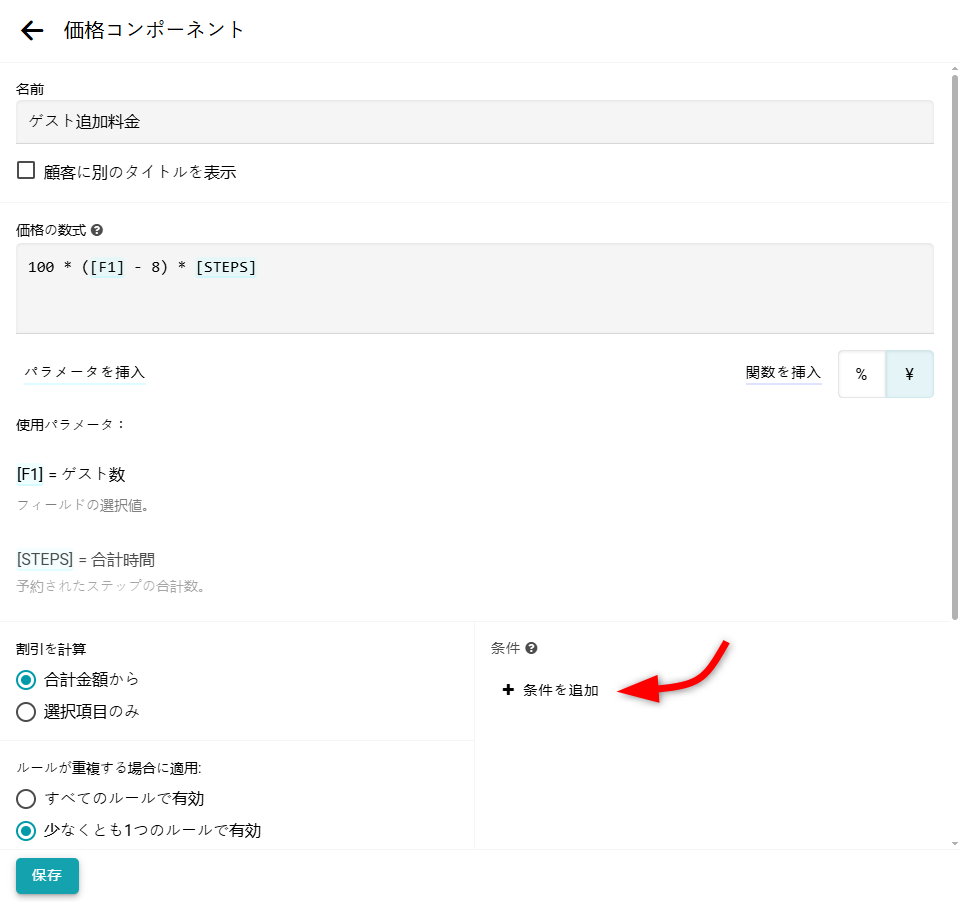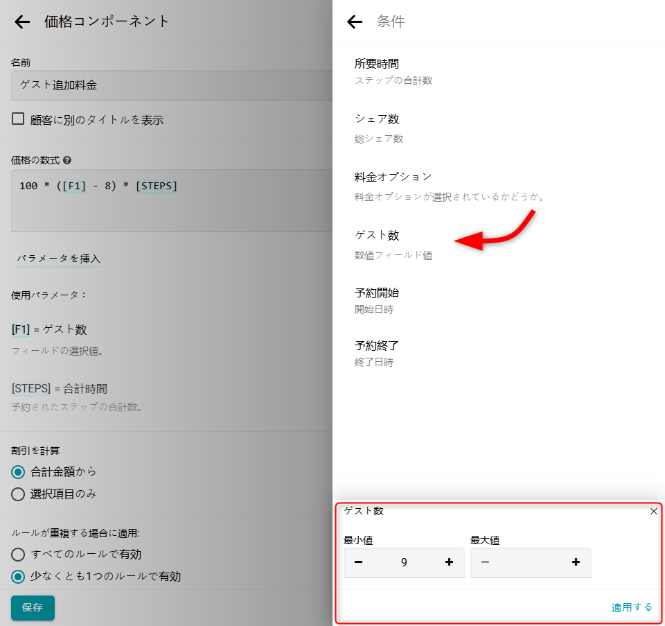 ゲスト数が8未満の場合、数式はマイナス値を返します。 これを防ぐために、条件を追加 ボタンをクリックし、最小ゲスト数を9に設定します。 これで、ゲスト数が9名以上の場合のみ価格コンポーネントが適用されます。 変更を保存してください。