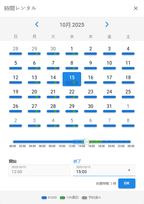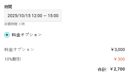 合計金額への割引は、予約が複数のルールにまたがっていても有効です。 例えば、12.00から15.00までの場合です。