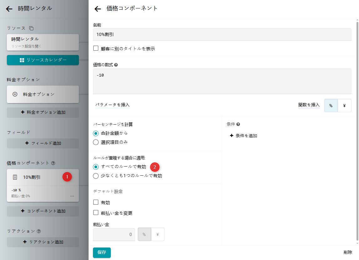 割引をルール内のみに適用するよう設定することもできます。 その場合、予約が複数のルールにまたがると割引は適用されません。 これを行うには、コンポーネント設定を開きます。 ルールが重複する場合の適用条件セクションで、すべてのルールで有効を選択し、保存します。