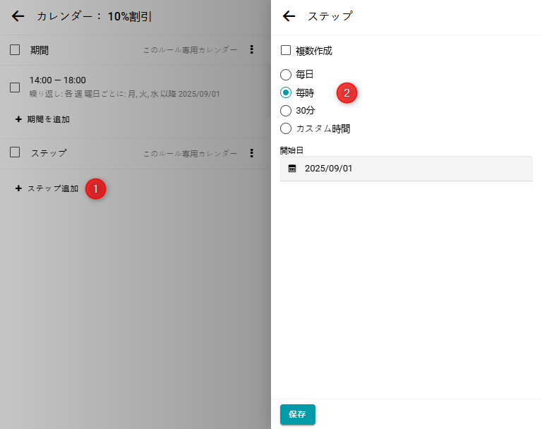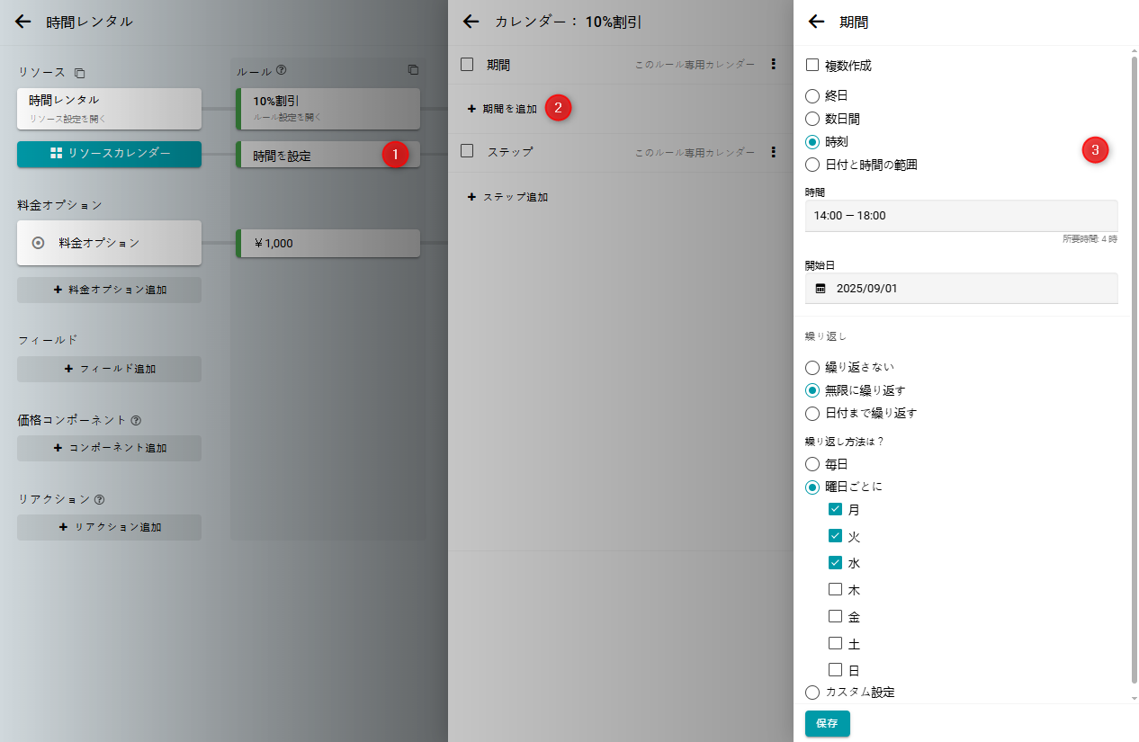 時間構成フォームで、期間を追加ボタンをクリックします。 割引を適用したい期間の開始時刻と終了時刻を入力してください。 割引が繰り返しの場合は、この期間がどのように繰り返されるかを指定します。