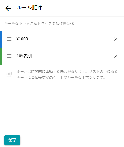新しく作成したルールは現在、優先度が最も低いため、 以前のルールによって上書きされています。 優先度を変更するには、並べ替えボタンをクリックしてください。
