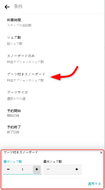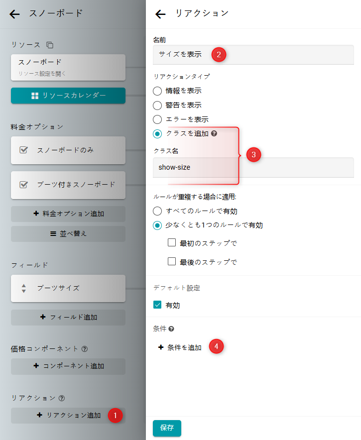 「スノーボード(ブーツ付き)」料金オプションのシェアが1つ選択されているという条件を選択し、保存します。