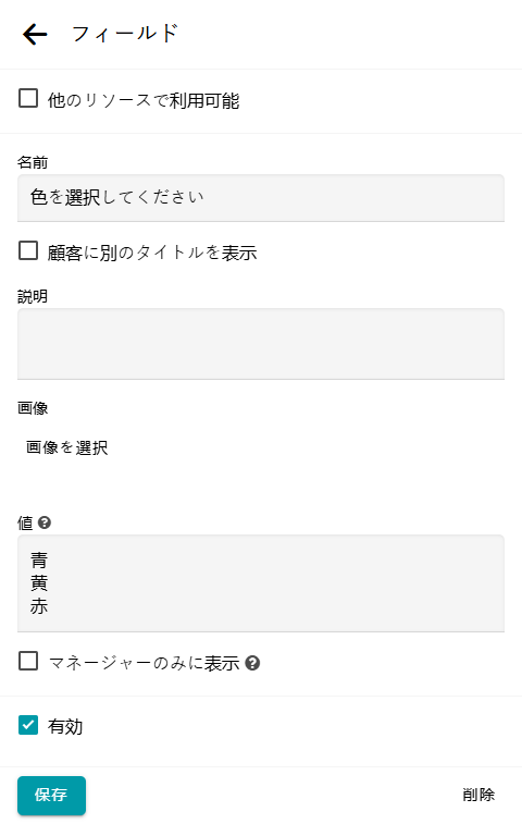 クライアントに複数の選択肢から1つを選ばせたい場合は、オプションフィールドを作成してください。 例:「色を選択してください」。