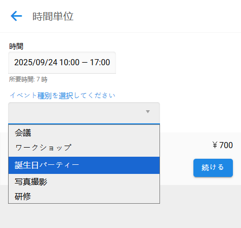 予約フォームでは、ドロップダウンフィールドはこのように表示されます: