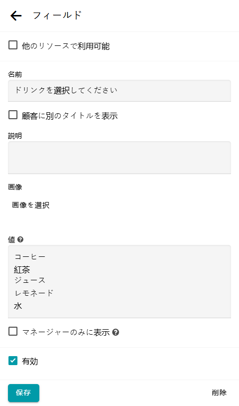 クライアントが複数の選択肢を同時に選べる場合は、複数選択肢フィールドを使用してください。 例:ドリンクの場合