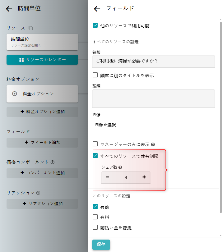 注意: フィールドが複数のリソースで使用され、数量制限がある場合、その制限はフィールドが有効なすべてのリソースの予約で共有されます。