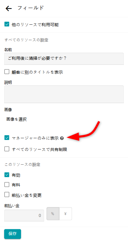 フィールドを予約フォームでクライアントに表示したくない場合は、フィールド設定でマネージャーのみに表示チェックボックスを有効にしてください。このようなフィールドはマネージャーのみに表示されます。