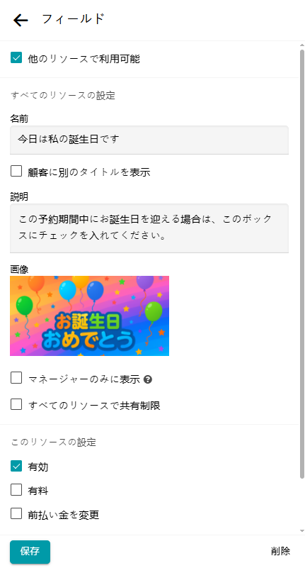 予約プロセス中にクライアントから必要な情報を自由に収集できます。 そのためには、リソース設定パネルを開き、必要なフィールドを追加してください。