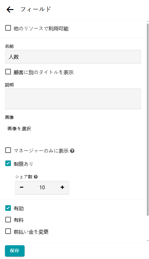 数値およびチェックボックスフィールドは、有料または数量制限付きに設定できます。