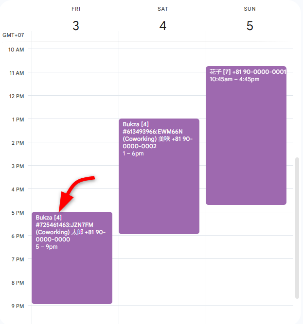 Googleカレンダーからデータを受信する際、重複を避けるため自分自身のイベントはスキップします。 Googleからインポートされたイベントは実際の予約には変換されず、カレンダー上の時間をブロックするだけです。 Googleカレンダー内の「Bukza以外」のイベントを変更した場合も、同期時にその変更がBukzaカレンダーに反映されます。 ただし、Bukzaタグが付いたイベントは編集しないでください。これらを変更しても、当システム内の元の予約には影響しません。