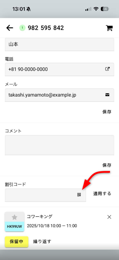 コード欄の横にあるスキャンボタンをタップするだけで、コードが注文に追加されます。