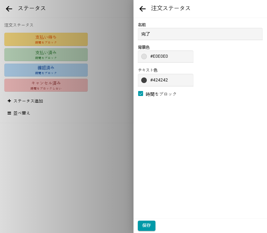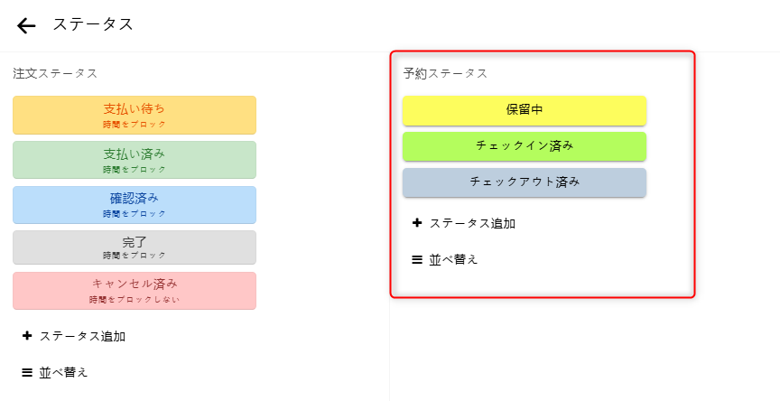 1つの注文には複数の予約を含めることができます。 注文とその予約にはそれぞれ独自のステータスがあります。 ステータスの作成、変更、削除や、並び順の変更が可能です。