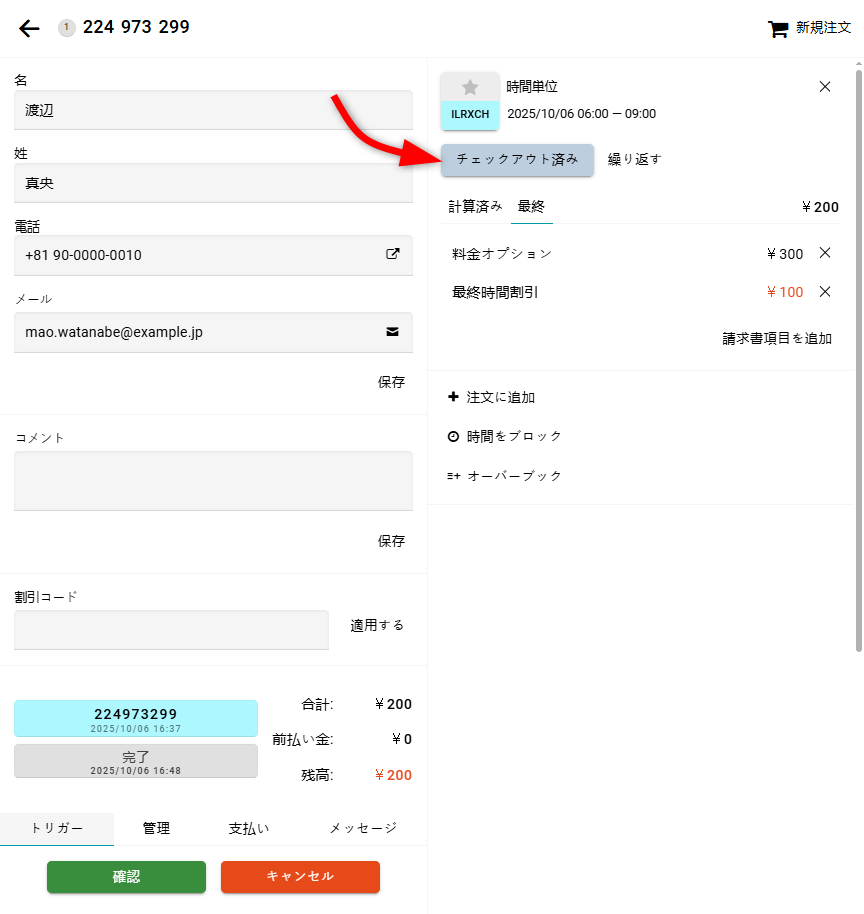 注文管理フォームで予約ステータスを変更できます。 現在のステータスのボタンをクリックすると、リストの次のステータスに進みます。