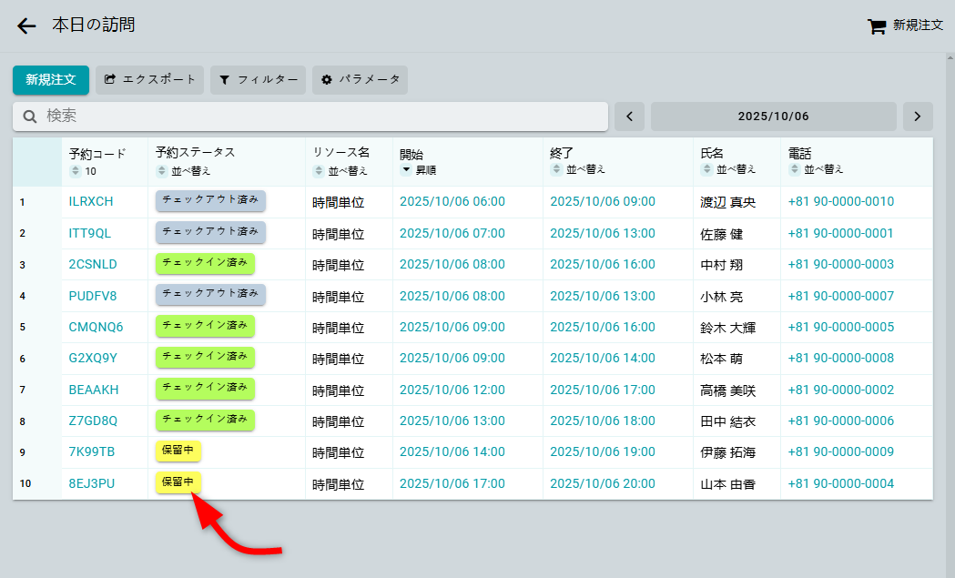注文ステータスや予約ステータスでテーブルデータをフィルタリングできます。 テーブルの構成についての詳細は