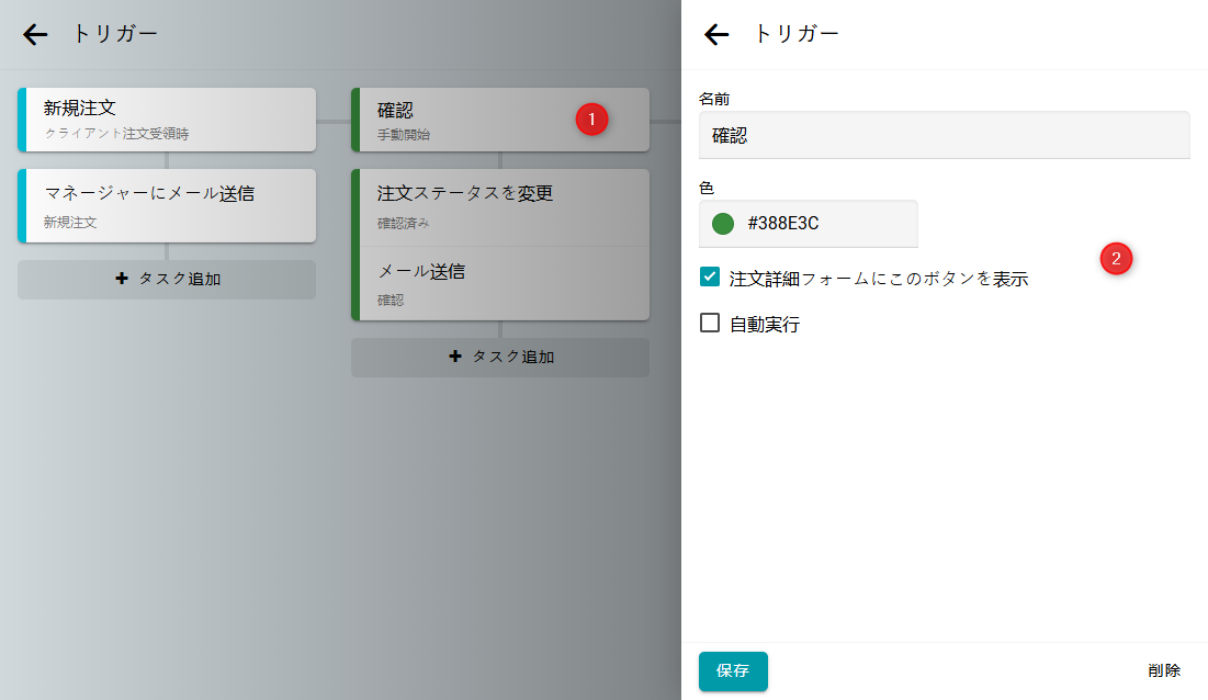 トリガーはタスクを実行するために使用します。 トリガーは自動的に、またはボタンをクリックして実行できます。 ボタンのテキストや色はカスタマイズ可能です。