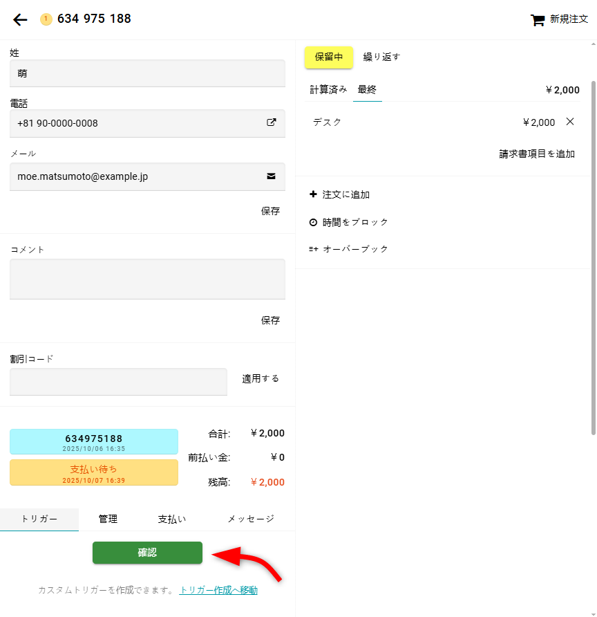 このボタンはマネージャーの注文フォームに表示できます。 そのためには、トリガー設定で該当するチェックボックスを有効にしてください。 ボタンはトリガータブに表示されます。