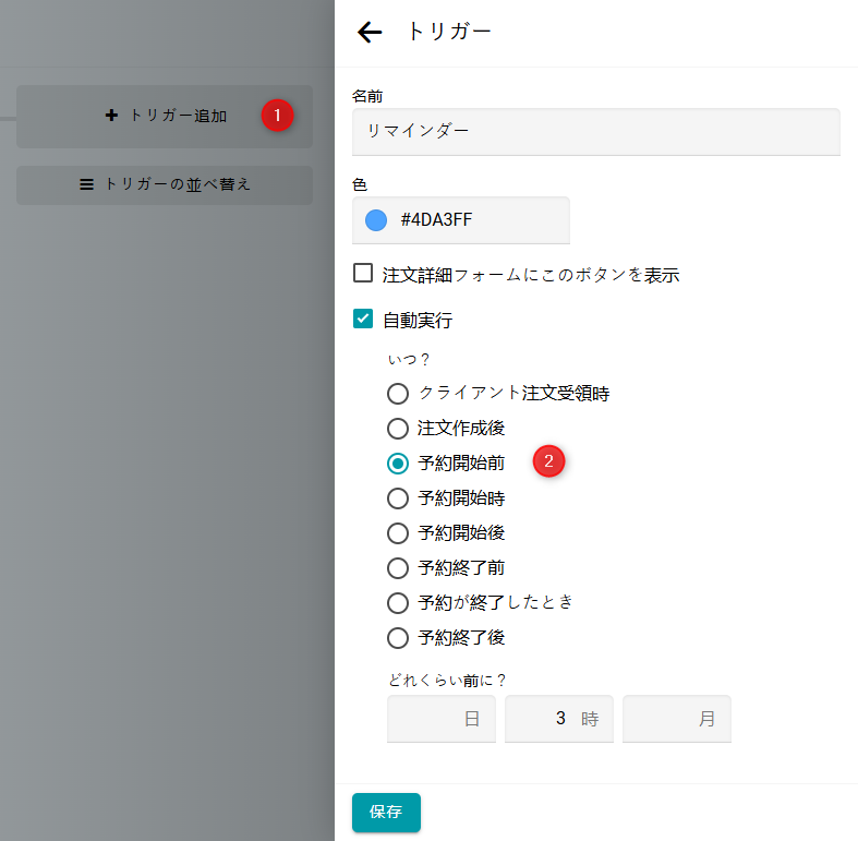 「リマインダー」という自動トリガーを作成します。予約開始前の3時間前に実行されるように設定します。