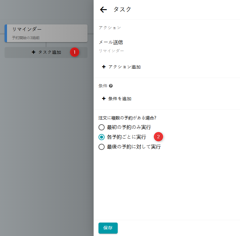 トリガーにタスクを追加します。メール送信「リマインダー」アクションも追加します。さらに、トリガーが各予約ごとに実行されるように指定します。
