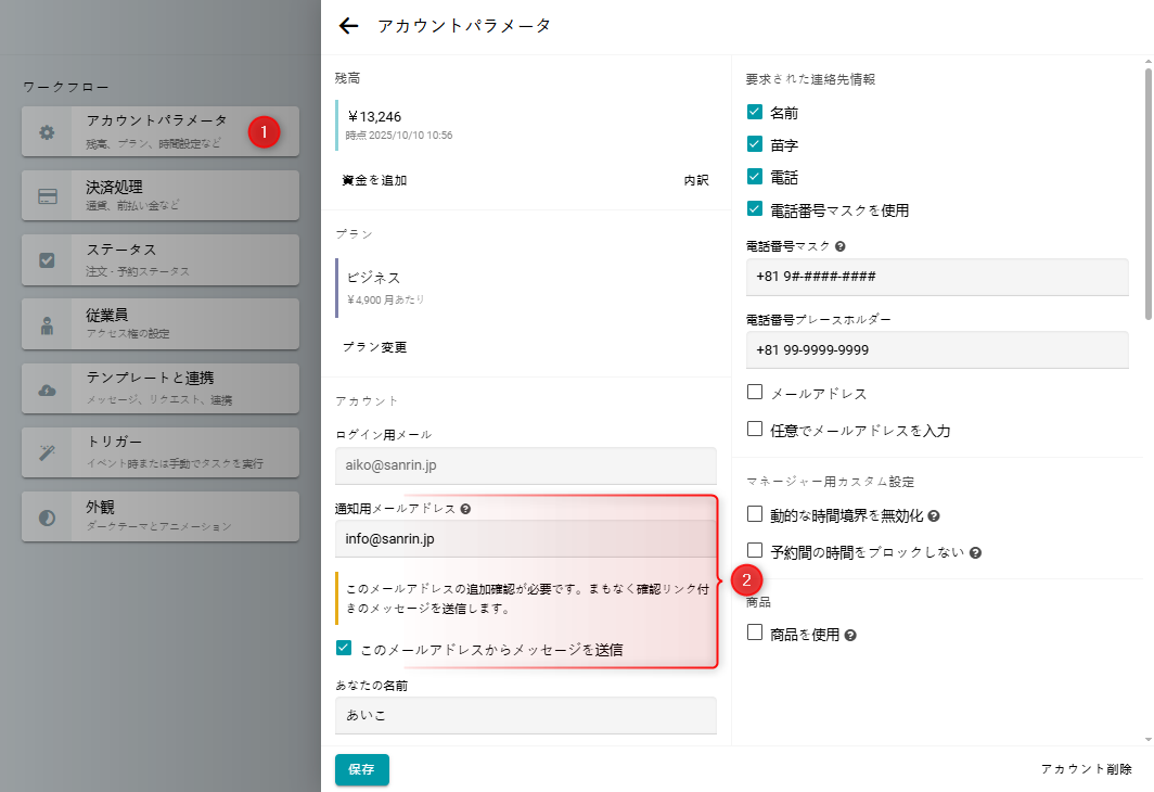 ビジネスプランにアップグレードした後、アカウントパラメータに進んでください。 通知用メールアドレス欄に御社のメールアドレスを入力します。 次に、このメールアドレスからメッセージを送信のチェックボックスを選択してください。 メール確認メッセージが届きますので、そのメッセージ内のリンクをクリックしてメールアドレスを確認してください。