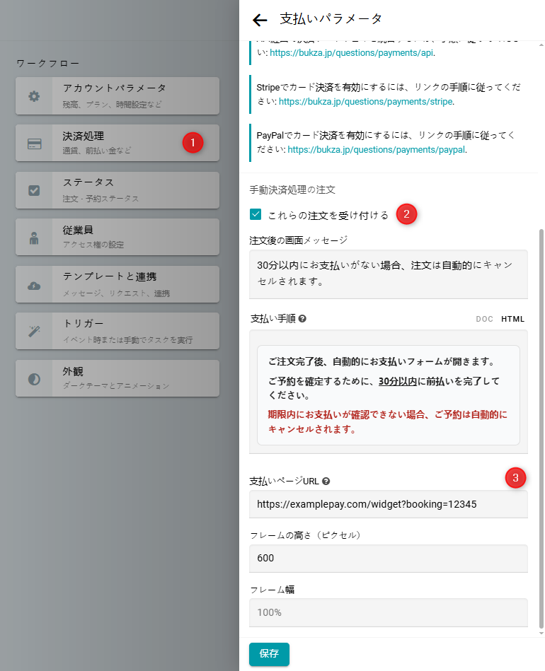 支払いページURLフィールドに、ご自身の支払いフォームのURLを入力してください。 このページは、注文完了後すぐにiframeで表示されます。 必要に応じて、支払い手順も記載してください。 これらの手順は注文カート内に表示されます。