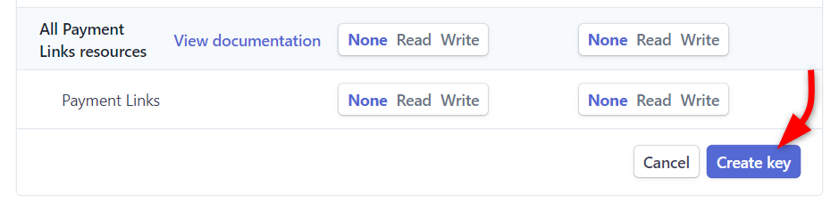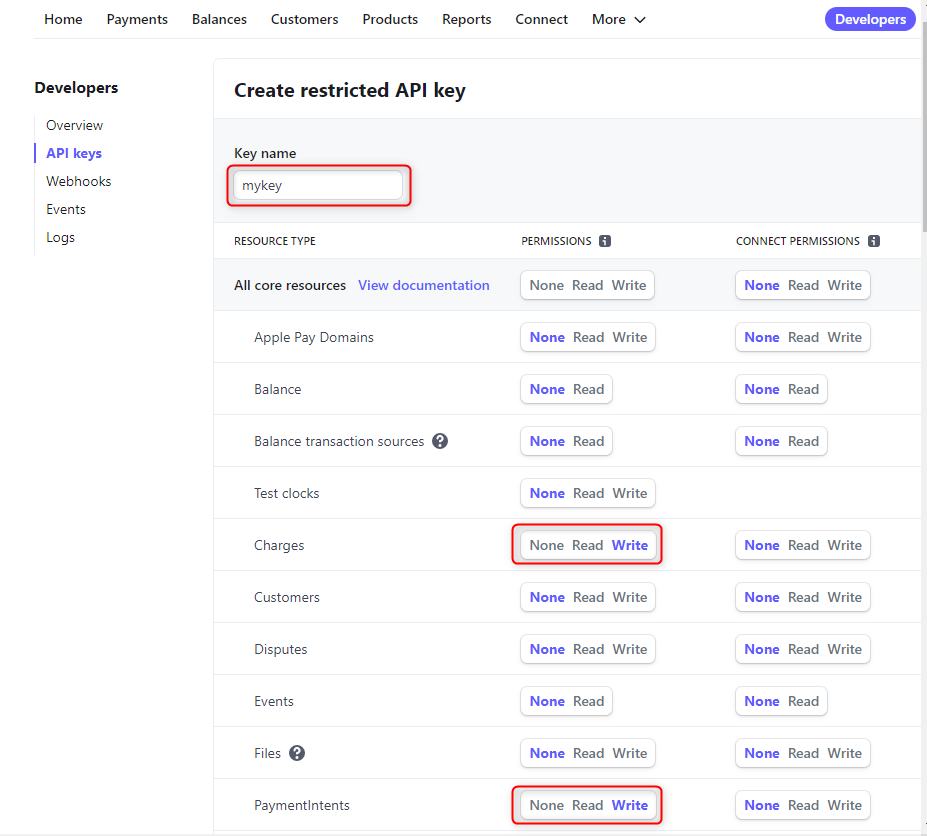 12. キーに分かりやすい名前を入力し、ChargesおよびPaymentIntentsリソースタイプに書き込み権限を設定します。