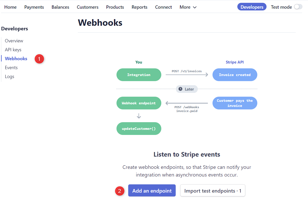 4. Webhooksタブで、エンドポイントを追加をクリックします。