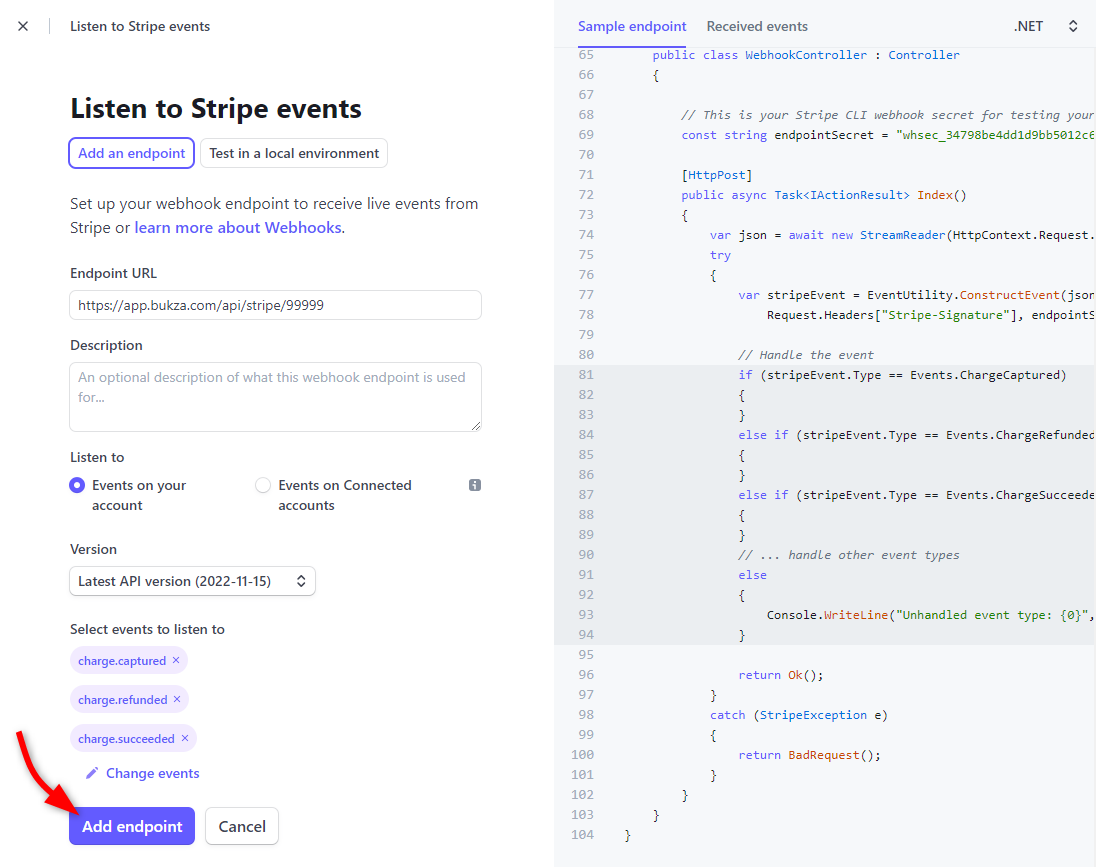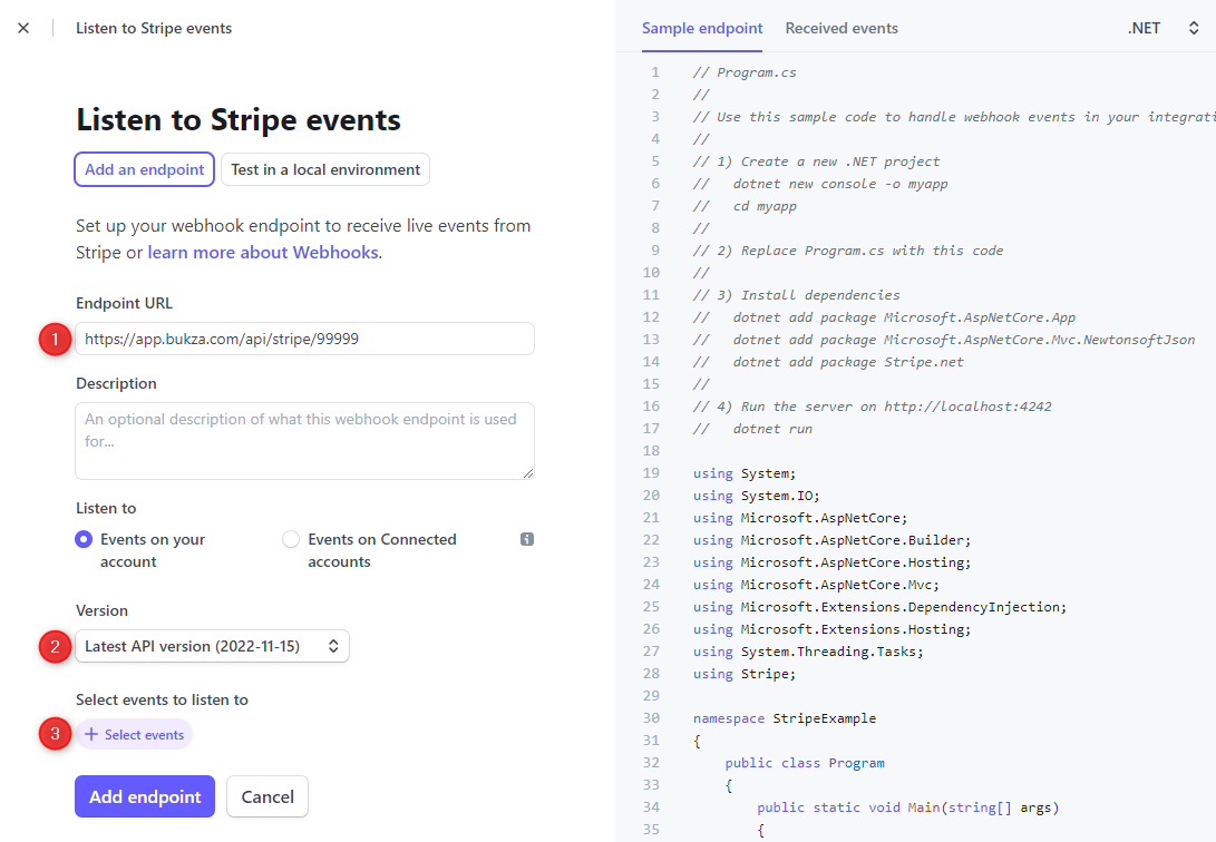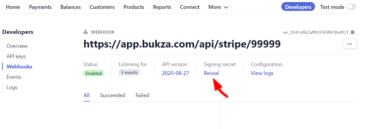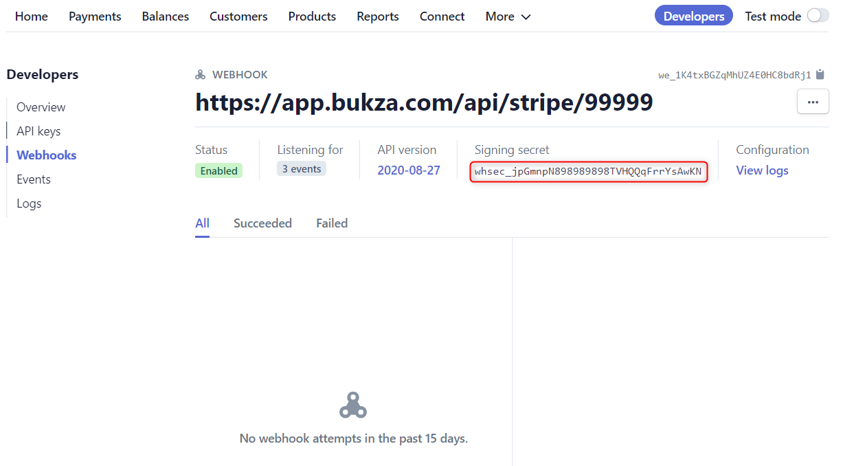 2. ウェブフックエンドポイントURLをお送りします。例:https://app.bukza.com/api/stripe/12345 のような形式です。