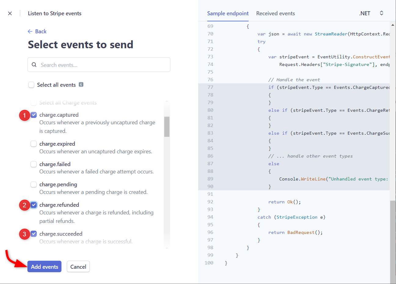 6. リストから次の3つのイベントを選択してください:charge.captured、charge.refunded、charge.succeeded。その後、イベントを追加をクリックします。