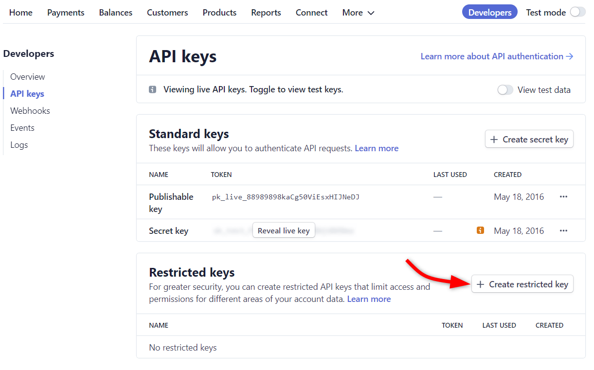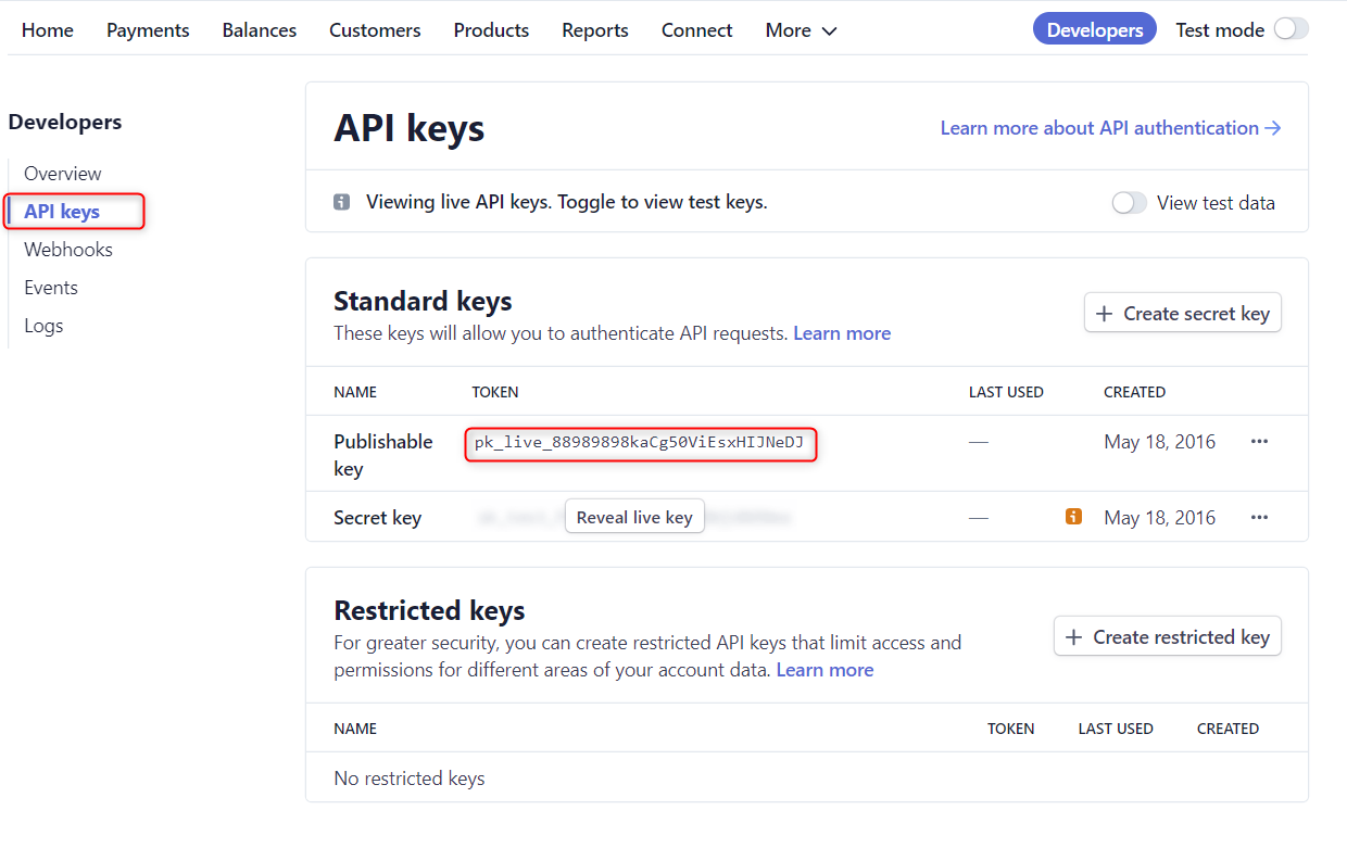 10. APIキーセクションを開きます。 ここでPublishable keyトークンが確認できます。 安全な場所に保存してください。 後で必要になります。