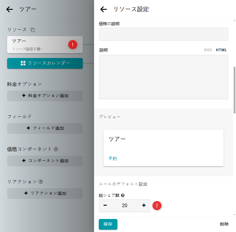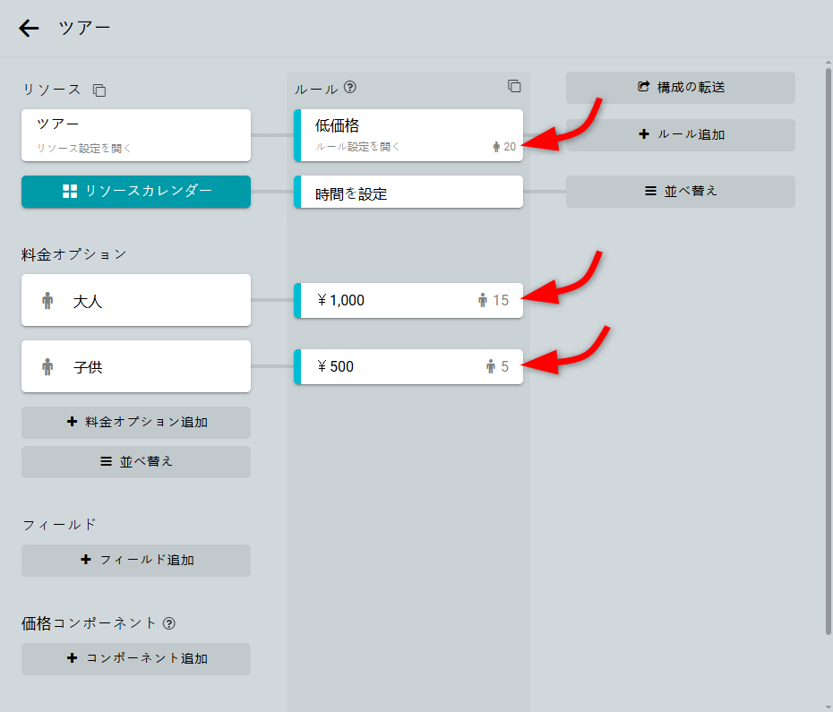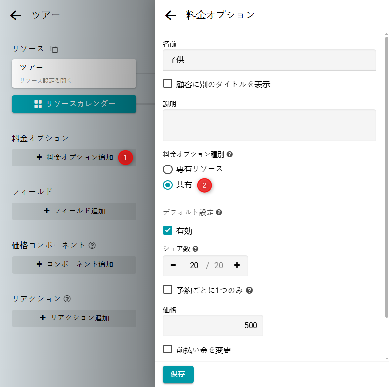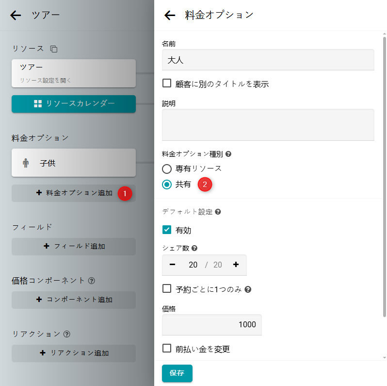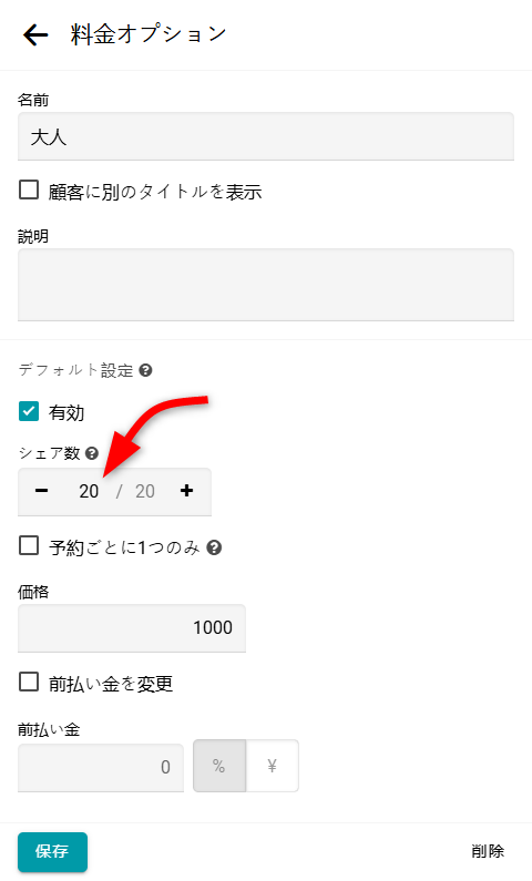 大人20枚、子供20枚のチケットを予約できるようにしたい場合は、両方の料金オプションのシェア数を20に設定してください。