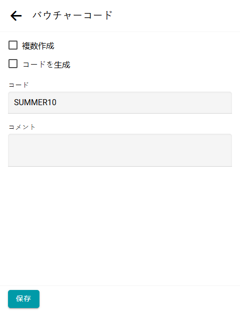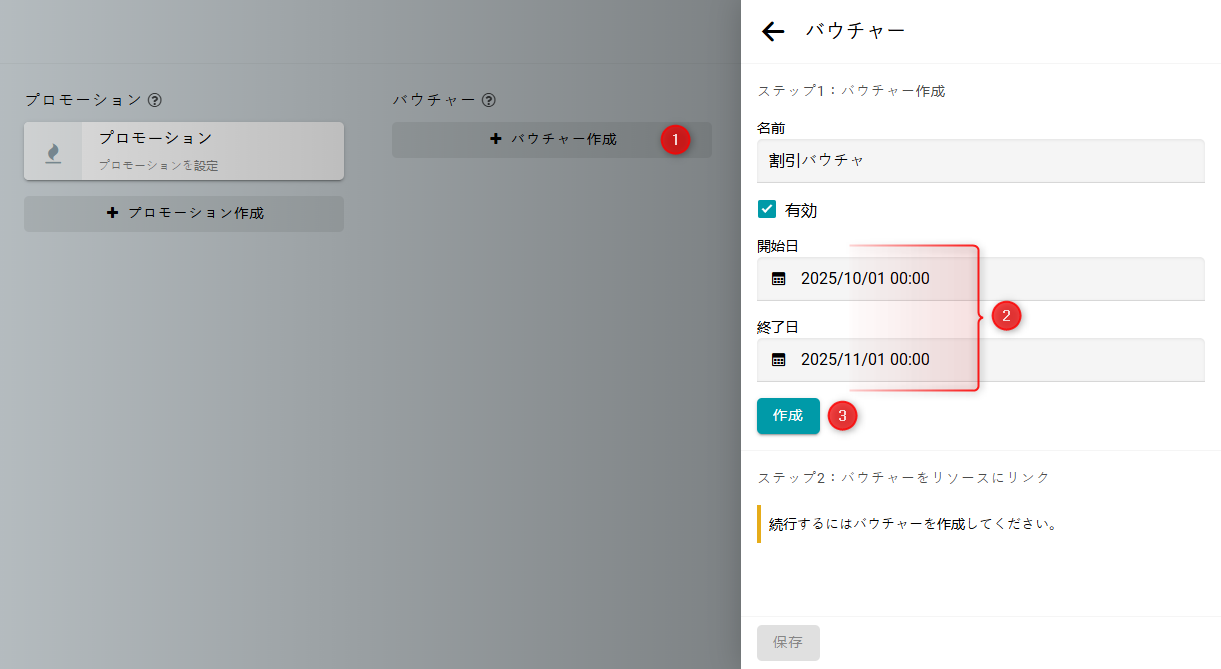 バウチャーコードが有効な期間を指定し、作成をクリックします。