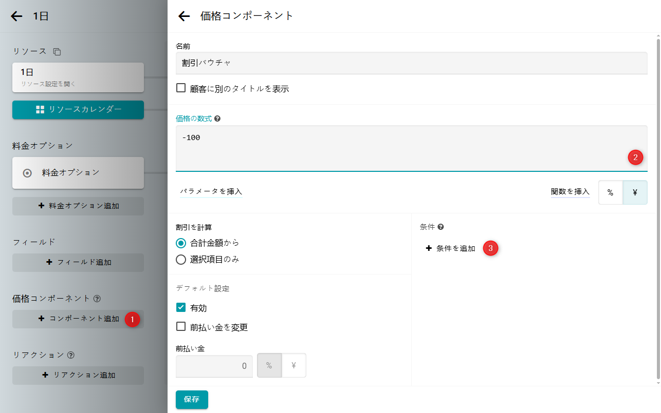 次に、このバウチャーをリソースに紐付ける必要があります。 そのためには、リソースの構成画面に移動してください。 価格コンポーネントを作成します。 名前を入力し、数式を指定します。 例:-100 および JPY。 その後、条件を追加ボタンをクリックします。