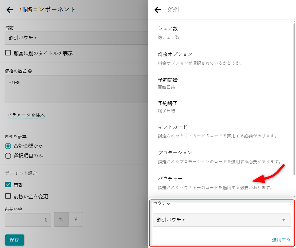 条件リストからバウチャーを選択します。 その後、作成したバウチャーを選択し、保存してください。